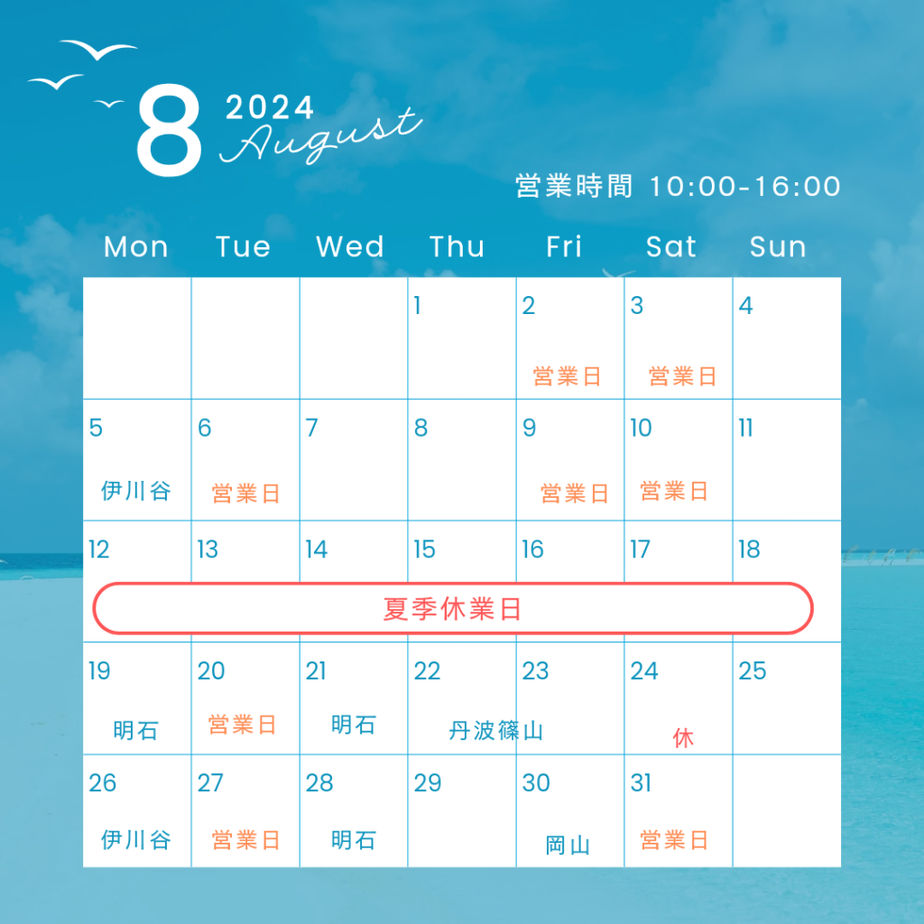 今月はお盆があるため、13日の週はお休みとなります🙏営業日が少なくなっていますので、